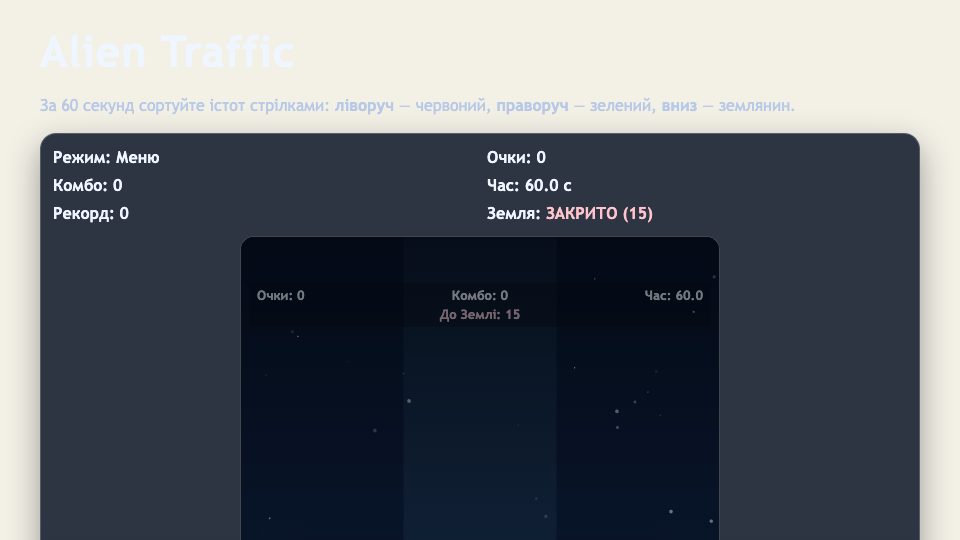 Перейти на TraficbankБраузерна міні-гра на швидкість: сортуйте прибульців стрілками по планетах, тримайте комбо, відкривайте Землю після 20 правильних відповідей поспіль і набирайте максимум очок за 60 секунд.