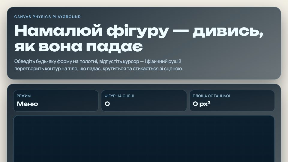 Інтерактивна фізична гра на canvas: намалюйте довільну фігуру, відпустіть палець або мишу — і спостерігайте, як об'єкт падає, обертається та стикається з іншими тілами.