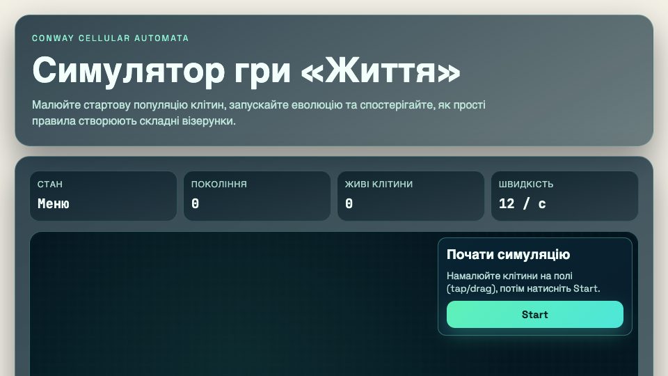 Красивий адаптивний симулятор Conway’s Game of Life: малюйте клітини, запускайте еволюцію, додавайте пресети й досліджуйте клітинний автомат прямо в браузері на смартфоні або ПК.