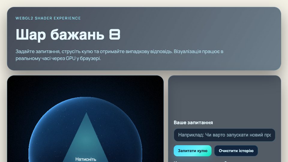Інтерактивний шар бажань (Magic 8 Ball) з сучасною WebGL2-графікою: задавайте питання, струшуйте кулю та отримуйте випадкові передбачення українською або російською.
