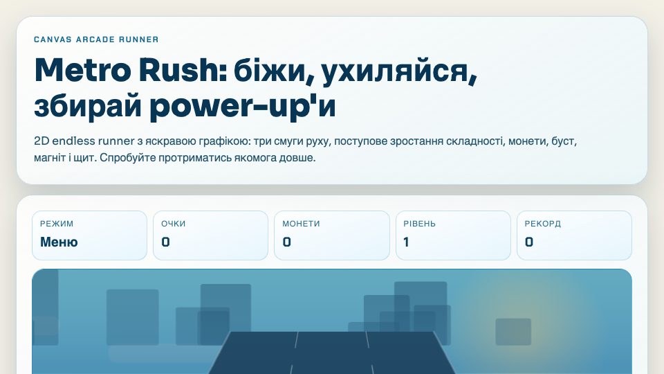 Динамічний 2D endless runner на canvas: перемикайте смуги, стрибайте, робіть підкат, збирайте монети, активуйте power-up'и та виживайте що довше при зростаючій складності.