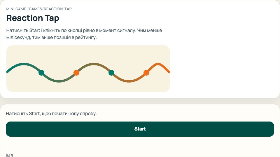 Миттєва міні-гра для тренування реакції: порівнюйте результат і зберігайте позиції в загальному рейтингу.