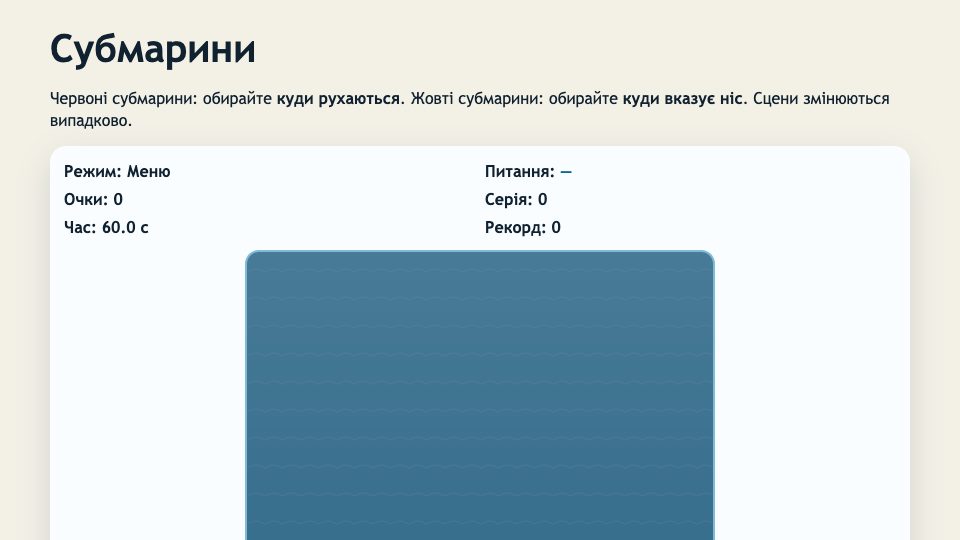 Мобільна браузерна гра на уважність: для червоних субмарин обирайте напрям руху, для жовтих — напрям носа. Випадкові сцени і комбо-механіка.