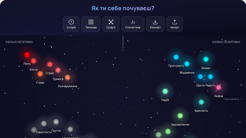 Відстежуйте свій емоційний стан на інтерактивній мапі: зберігайте записи, дивіться історію, теплову мапу й статистику.