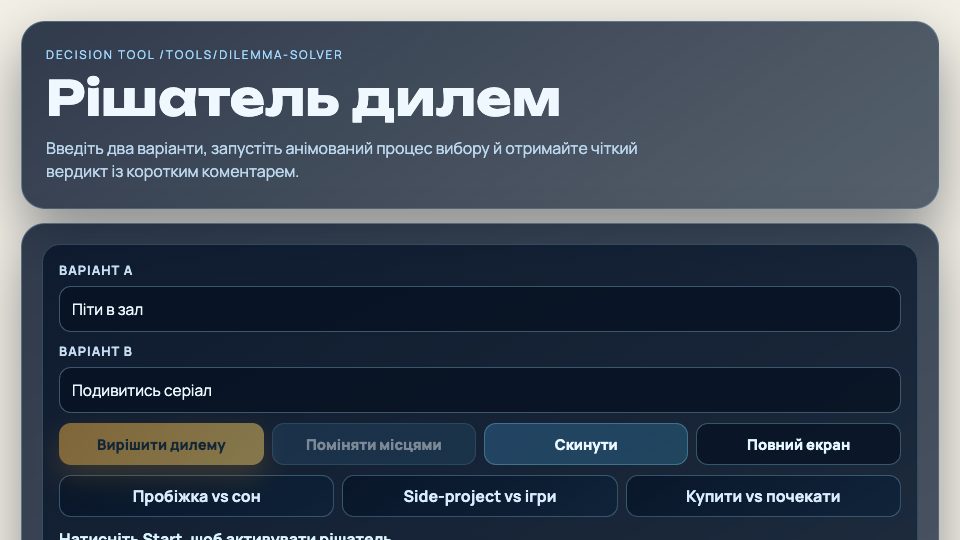 Інтерактивний рішатель дилем: введіть два варіанти, запустіть анімований процес вибору та отримайте короткий вердикт із коментарем.