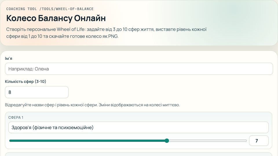 Коучинговий інструмент Колесо Балансу: додайте 3-10 сфер життя, оцініть кожну від 1 до 10, задайте ім'я та скачайте красиву PNG-візуалізацію для консультацій, саморефлексії і постановки цілей.