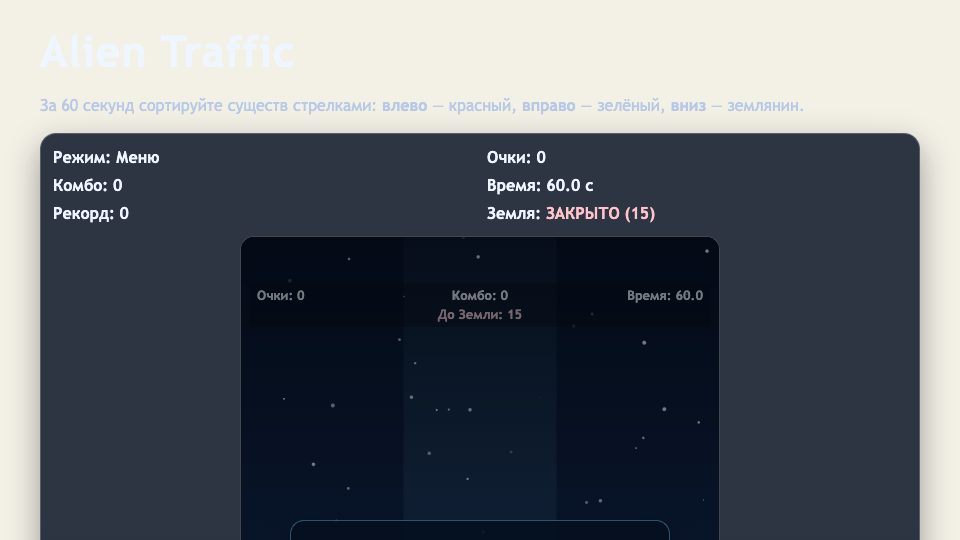 Перейти на TraficbankБраузерная мини-игра на скорость: сортируйте пришельцев стрелками по планетам, держите комбо, открывайте Землю после 20 правильных ответов подряд и набирайте максимум очков за 60 секунд.