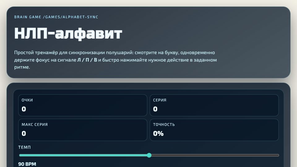 Наглядный и простой тренажёр НЛП-алфавит: видите букву и сигнал Л/П/В, отвечаете в ритме и тренируете координацию внимания.