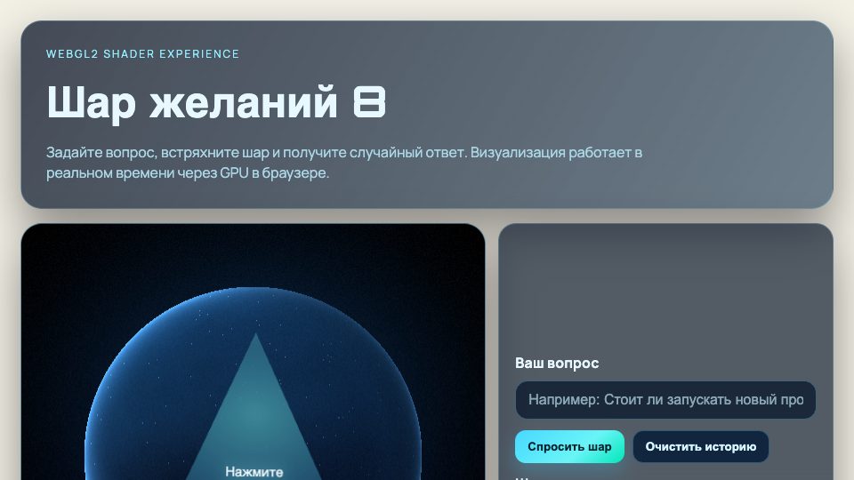 Интерактивный шар желаний (Magic 8 Ball) с современной WebGL2-графикой: задавайте вопросы, встряхивайте шар и получайте случайные предсказания на украинском или русском.