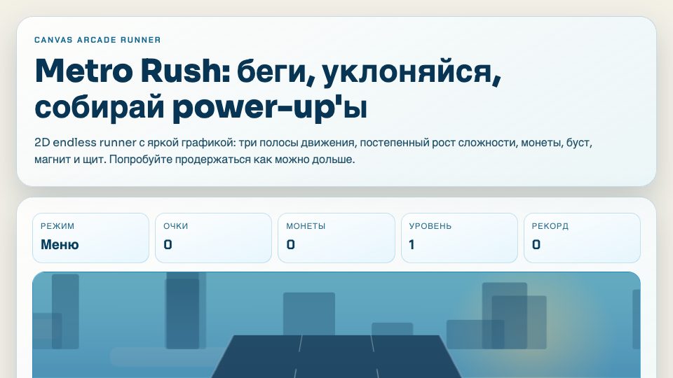 Динамичный 2D endless runner на canvas: переключайте полосы, прыгайте, делайте подкат, собирайте монеты, активируйте power-up'ы и выживайте как можно дольше при растущей сложности.