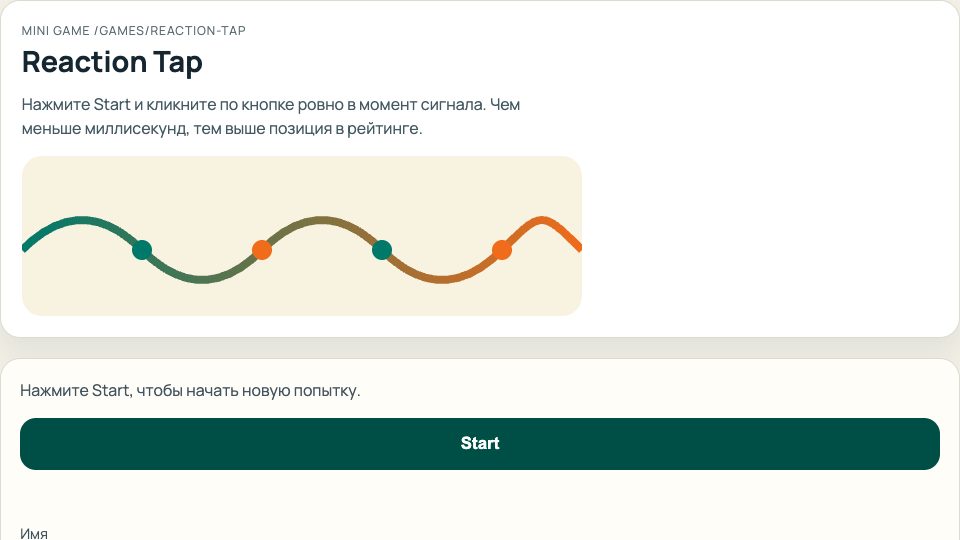 Мгновенная мини-игра для тренировки реакции: сравнивайте результат и сохраняйте позиции в общем рейтинге.