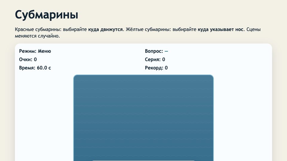 Мобильная браузерная игра на внимательность: для красных субмарин выбирайте направление движения, для жёлтых — направление носа. Случайные сцены и комбо-механика.