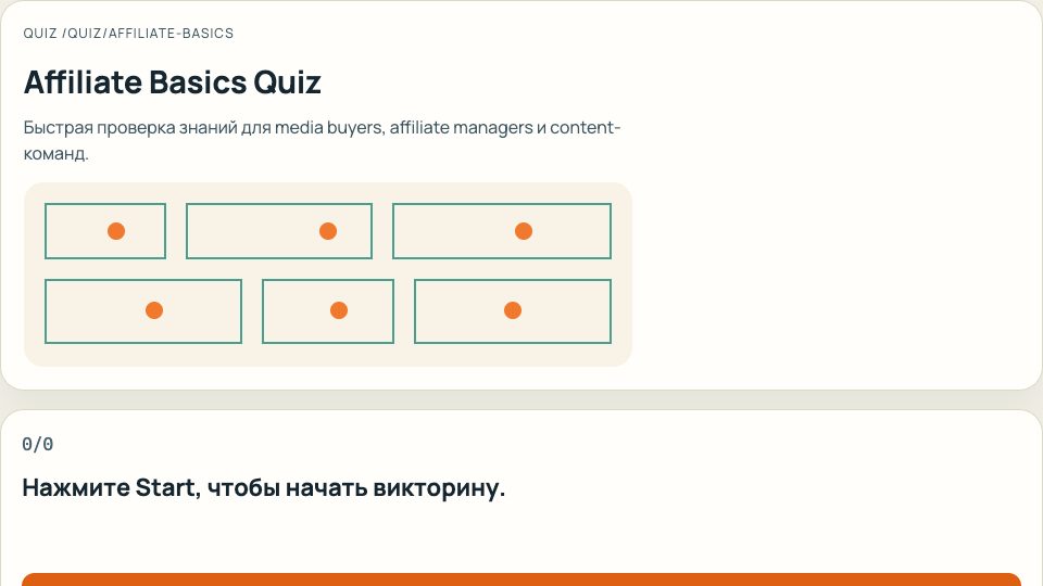 Викторина про основы affiliate-marketing: CTR, EPC, source tracking, compliance и фреймворк тестирования креативов.