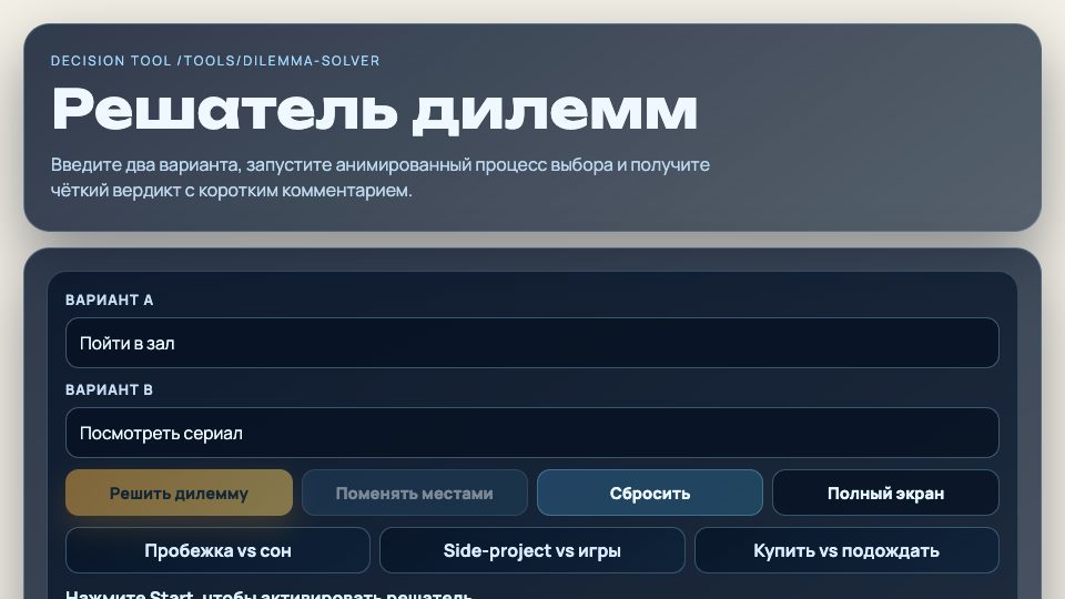 Интерактивный решатель дилемм: введите два варианта, запустите анимированный процесс выбора и получите короткий вердикт с комментарием.