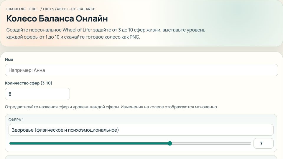 Коучинговый инструмент Колесо Баланса: добавьте 3-10 сфер жизни, оцените каждую от 1 до 10, укажите имя и скачайте красивую PNG-визуализацию для консультаций, саморефлексии и постановки целей.
